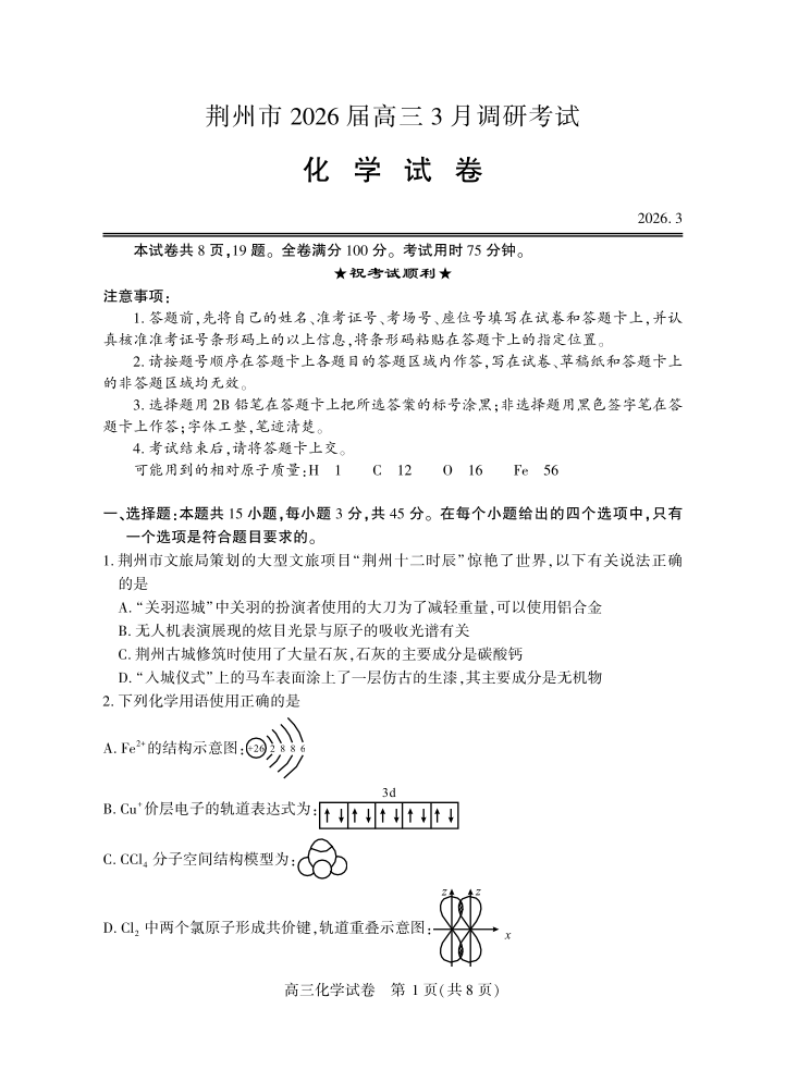高三化学--湖北省荆州市2026届高三3月调研考试