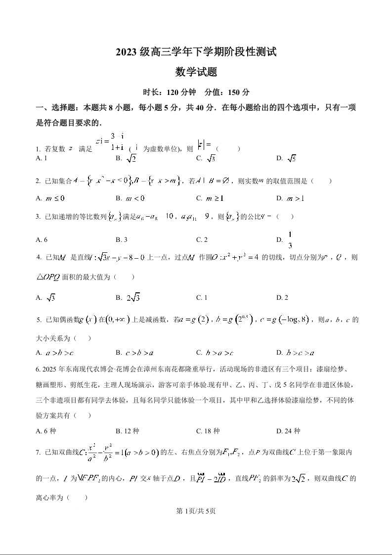 高三数学(原卷版)--黑龙江省牡丹江市第一高级中学2026届高三下学期3月模拟预测