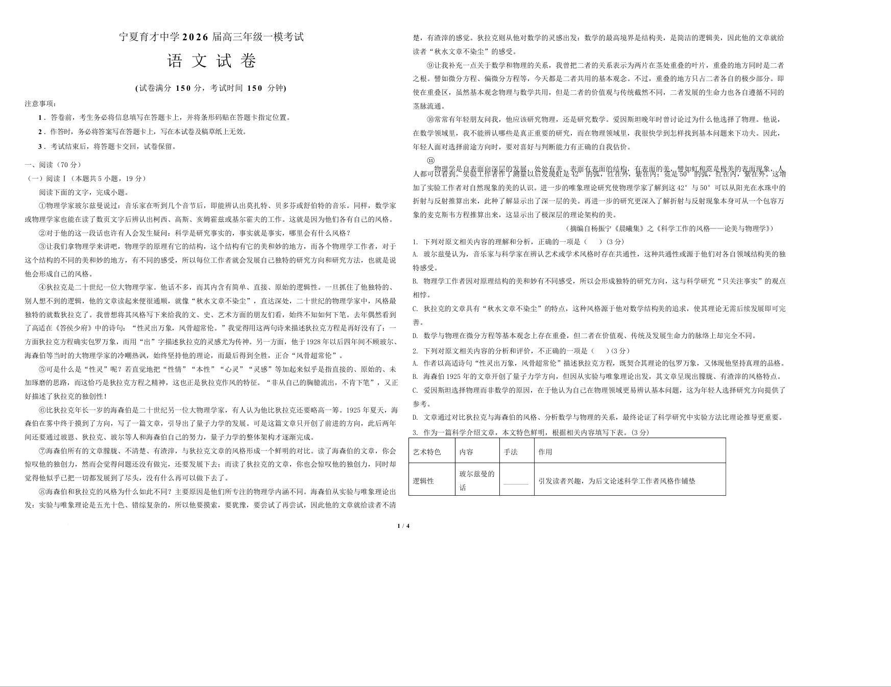 高三语文--宁夏育才中学2026 届高三下学期3月一模考试