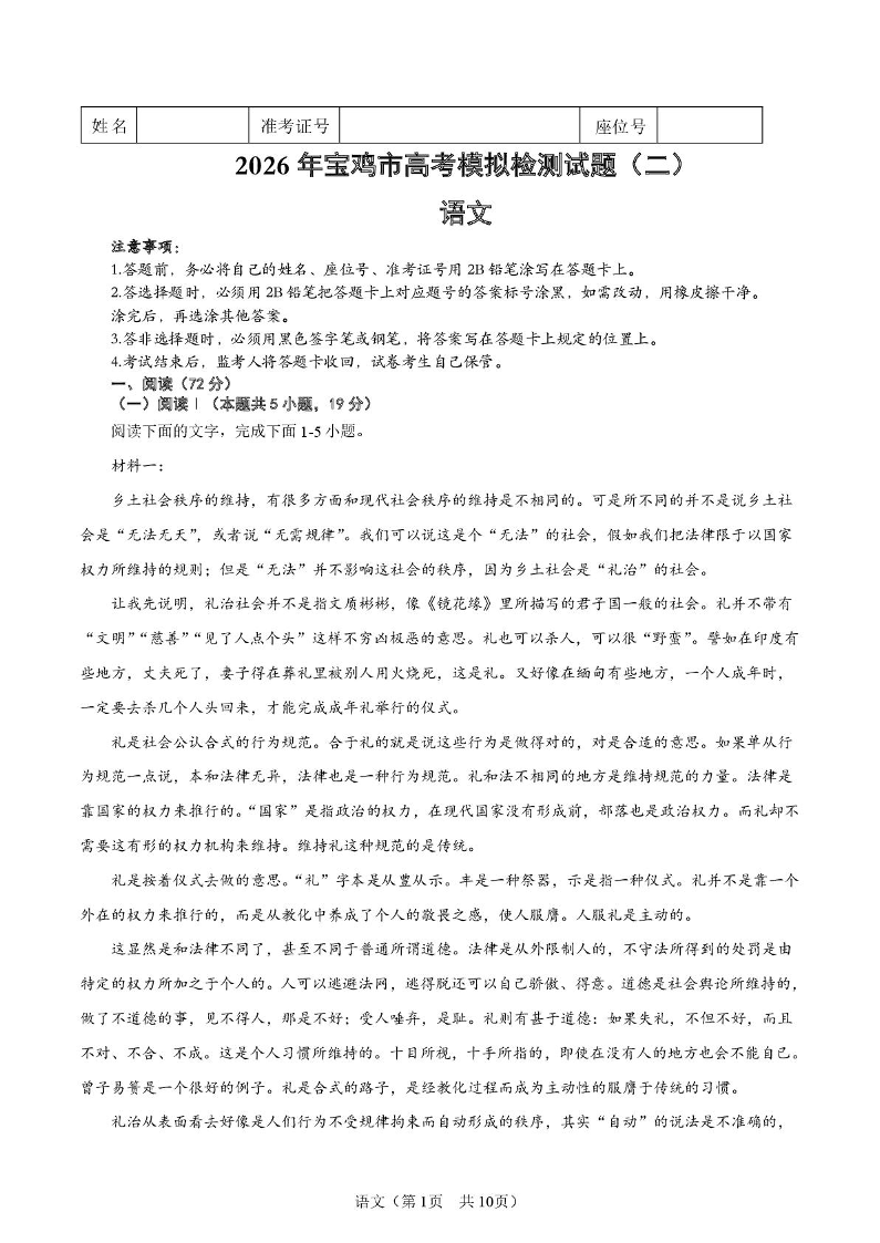 高三语文+答案--陕西省宝鸡市2026届高考模拟检测试题(二)(宝鸡二模)