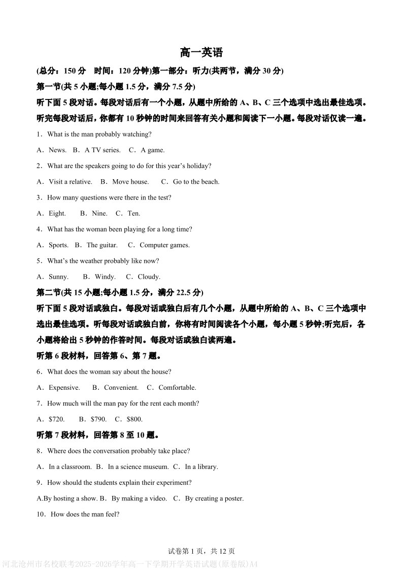 高一英语--河北沧州市名校联考2025-2026学年高一下学期开学考试