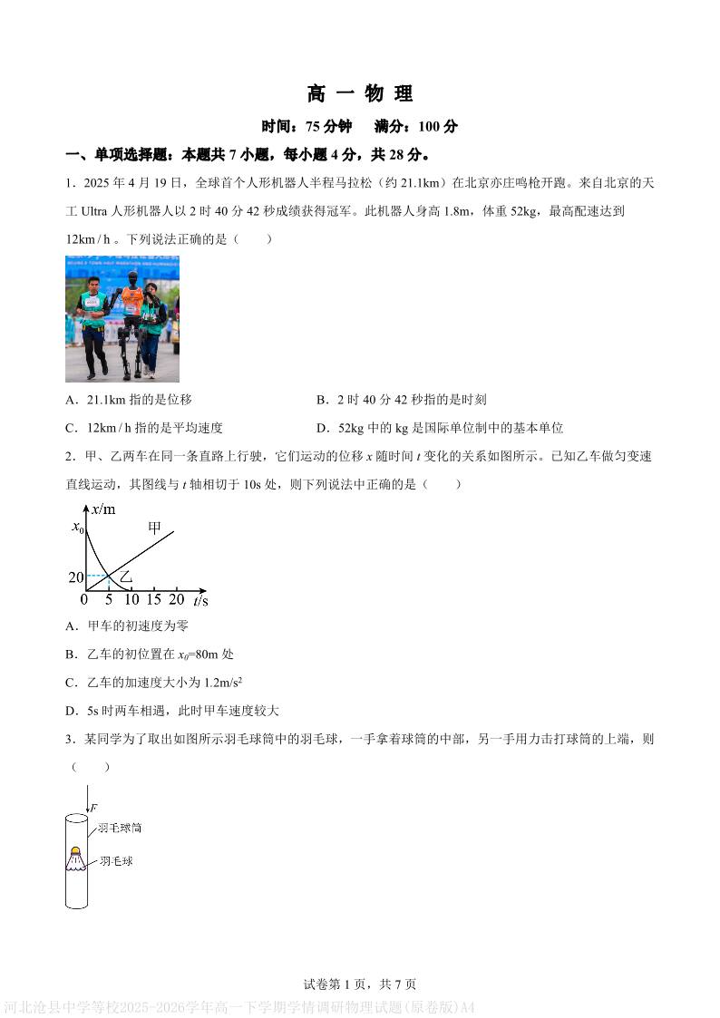 高一物理--河北沧州市名校联考2025-2026学年高一下学期开学考试