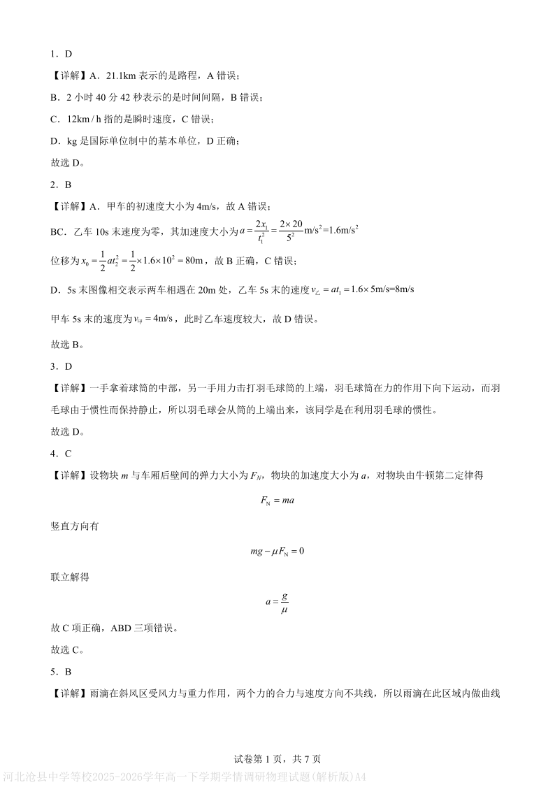 高一物理答案--河北沧州市名校联考2025-2026学年高一下学期开学考试