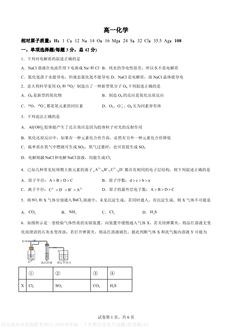 高一化学--河北沧州市名校联考2025-2026学年高一下学期开学考试
