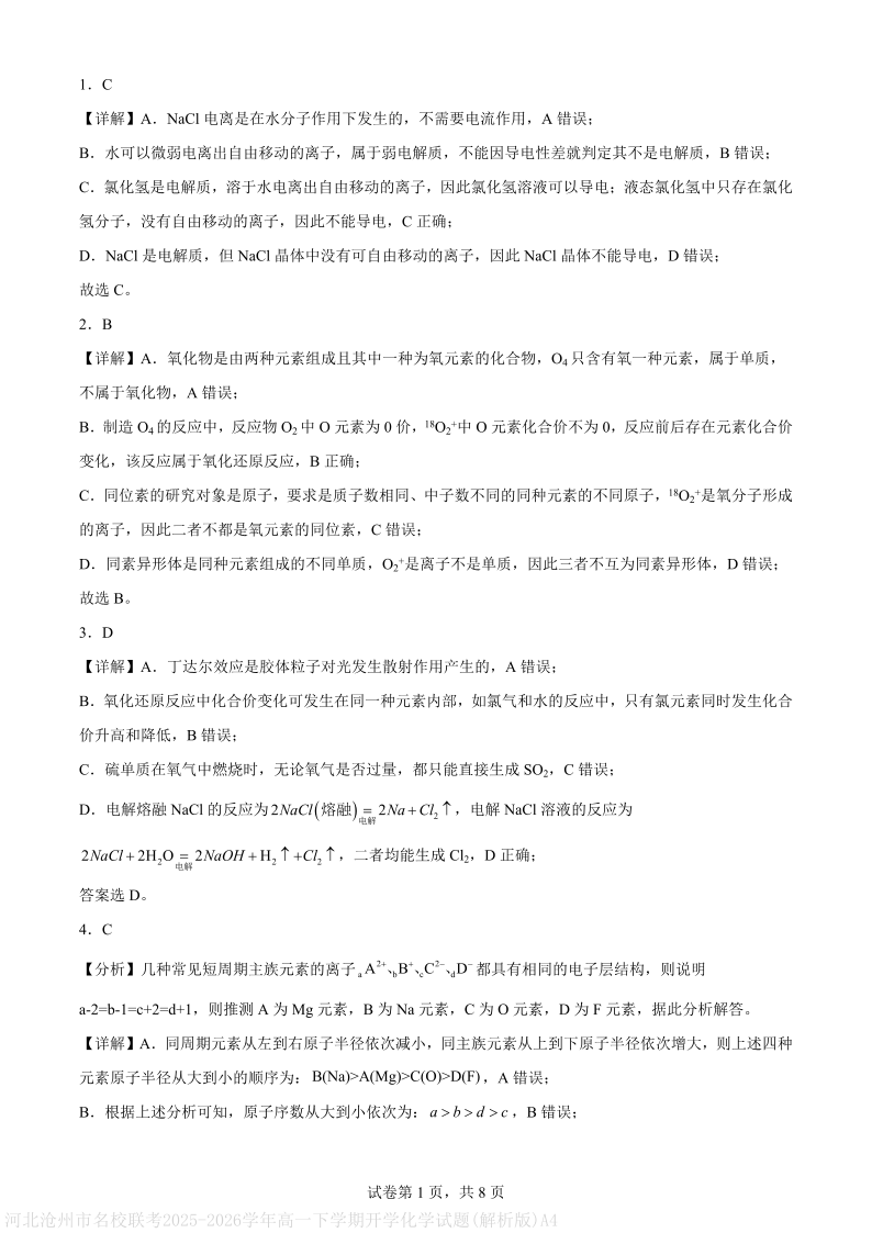 高一化学答案--河北沧州市名校联考2025-2026学年高一下学期开学考试