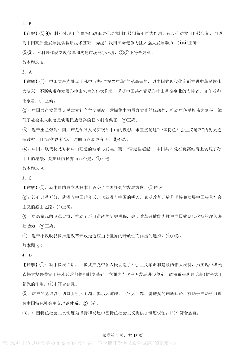 高一政治--河北沧州市名校联考2025-2026学年高一下学期开学考试