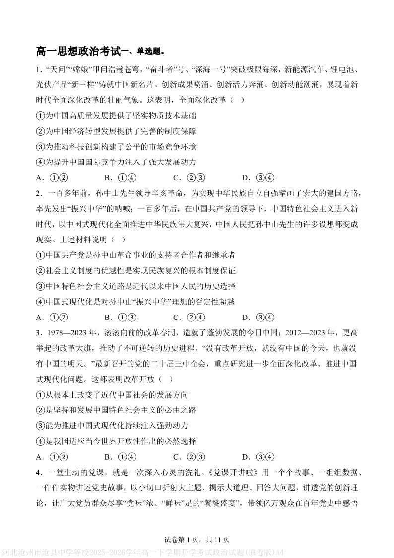 高一政治答案--河北沧州市名校联考2025-2026学年高一下学期开学考试