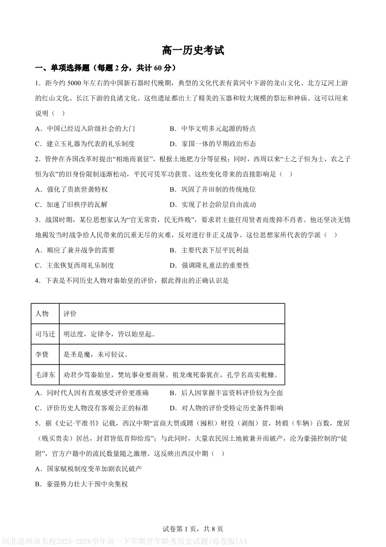 高一历史--河北沧州市名校联考2025-2026学年高一下学期开学考试