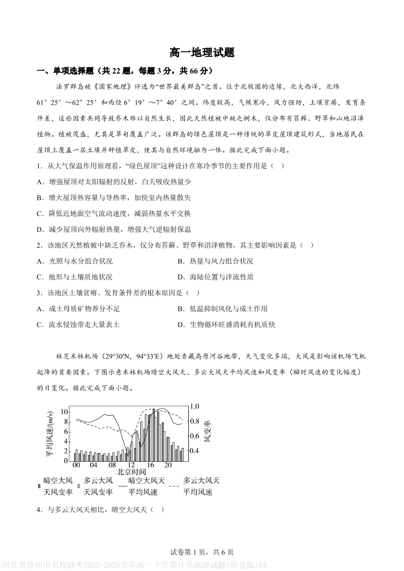 高一地理--河北沧州市名校联考2025-2026学年高一下学期开学考试