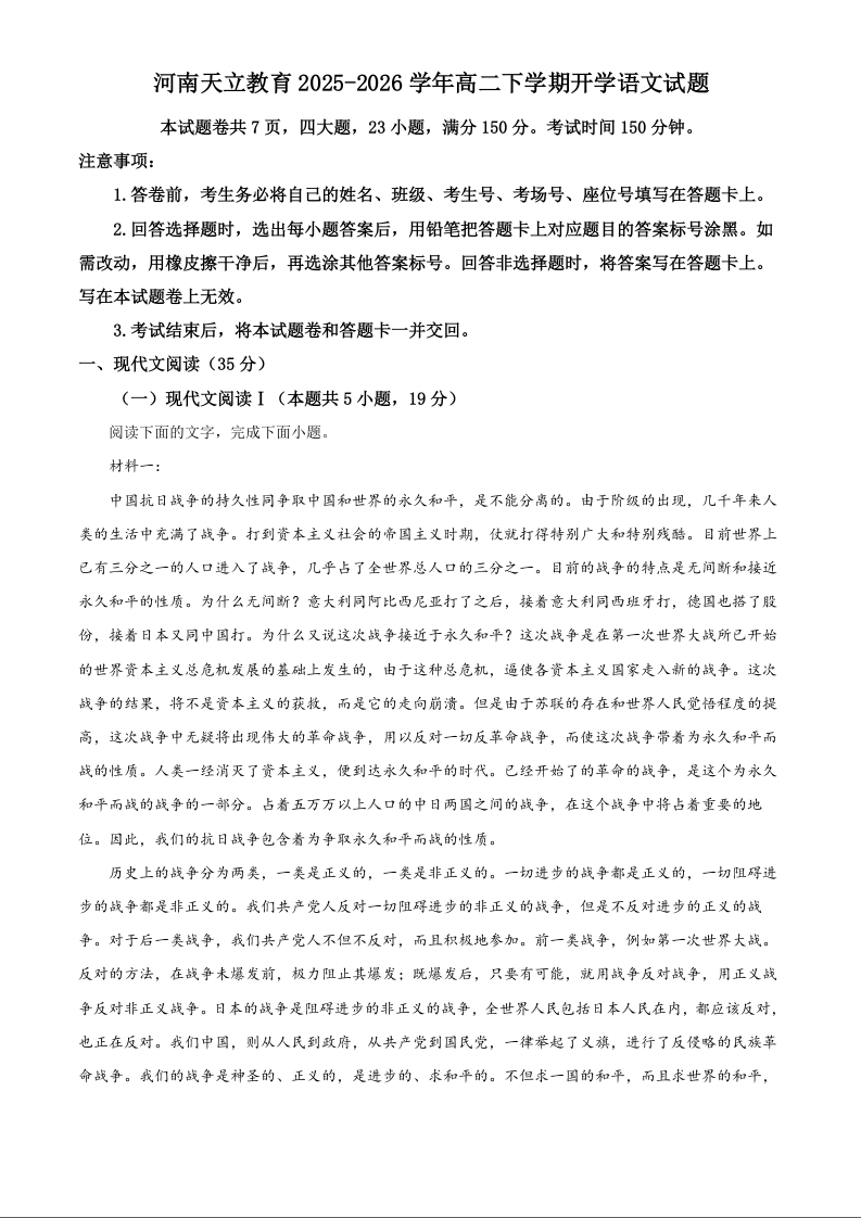 高三语文(解析版)--河南省周口市天立教育2025-2026学年高二下学期开学考试