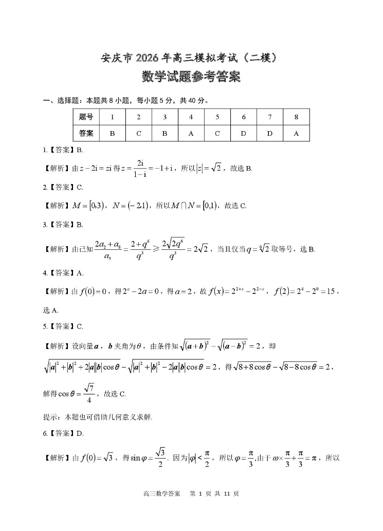 高三数学答案--安徽省安庆市2026届高三下学期3月模拟考试(安庆二模)