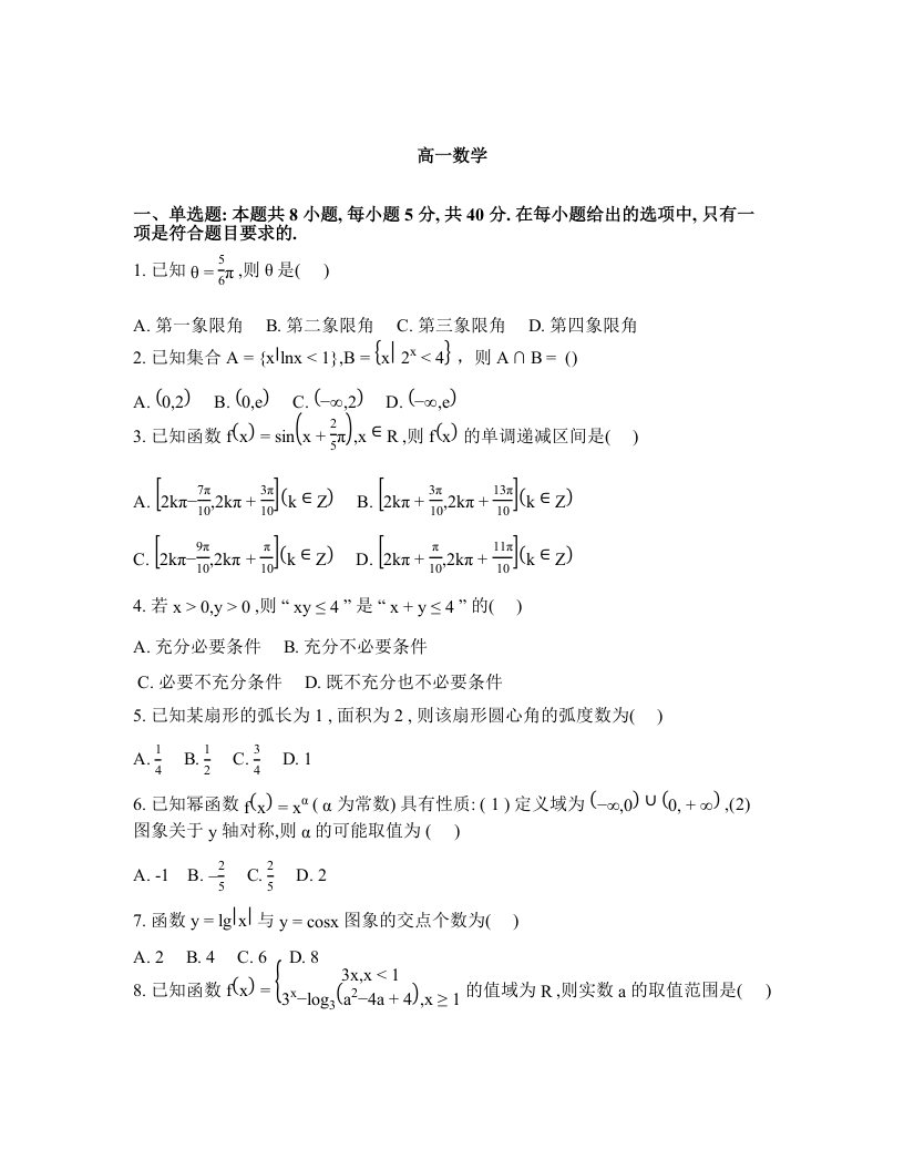 高一数学+答案--湖北省楚天协作体2025-2026学年高一下学期3月阶段检测