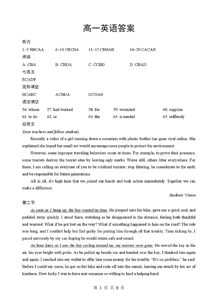 高一英语答案--湖北省楚天协作体2025-2026学年高一下学期3月阶段检测