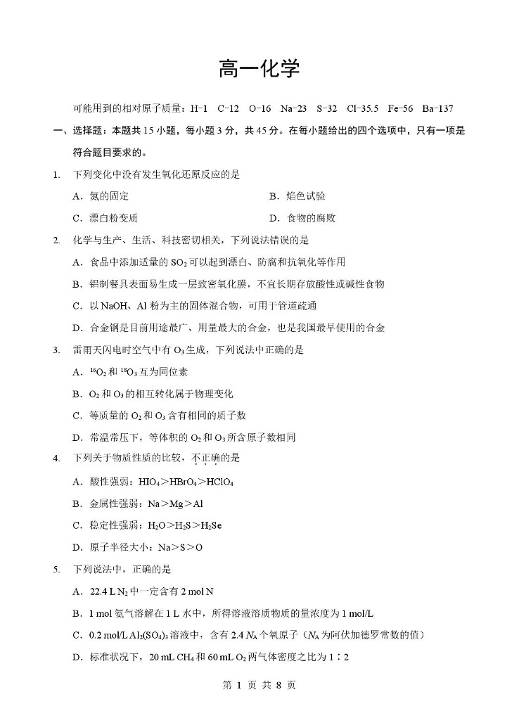 高一化学--湖北省楚天协作体2025-2026学年高一下学期3月阶段检测