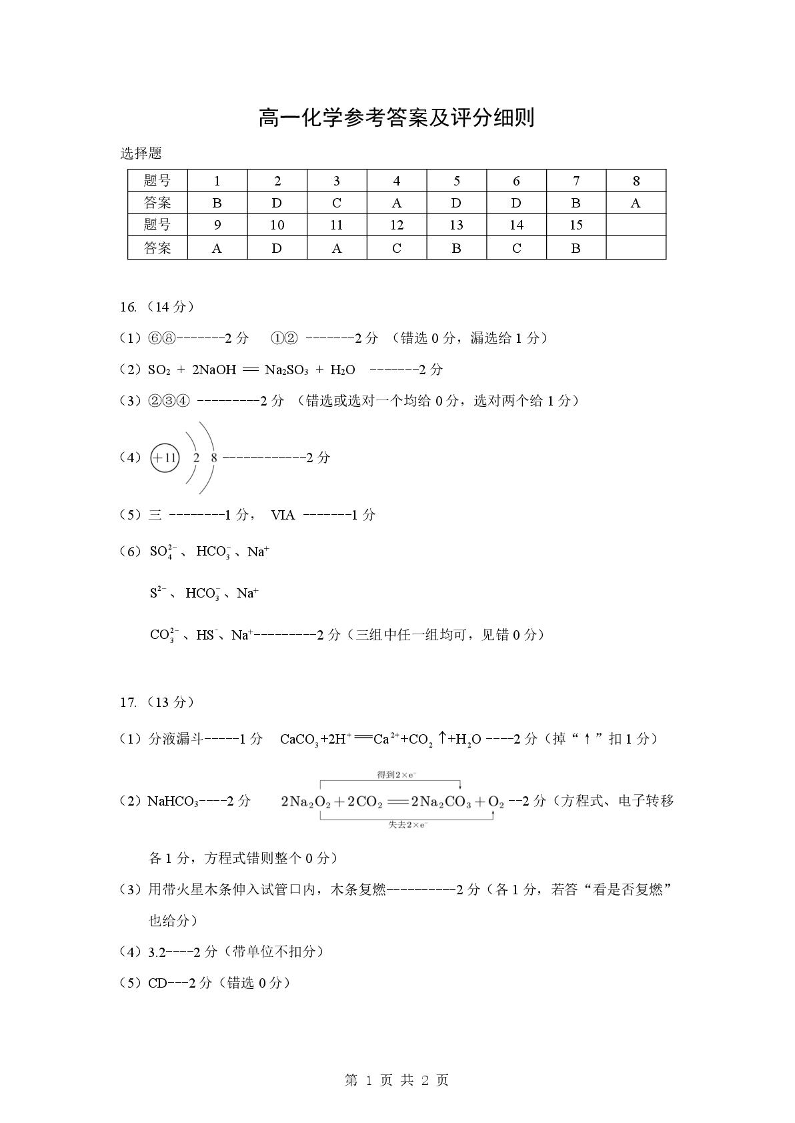 高一化学答案--湖北省楚天协作体2025-2026学年高一下学期3月阶段检测