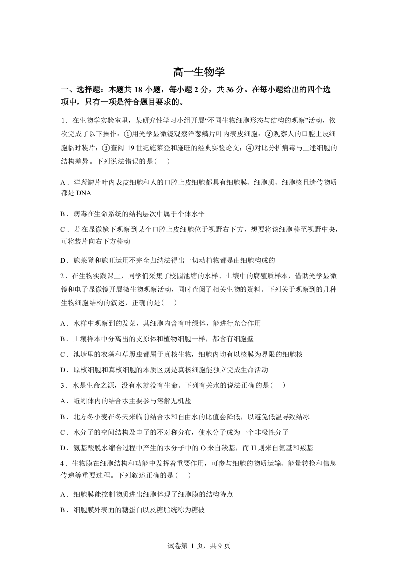 高一生物+答案--湖北省楚天协作体2025-2026学年高一下学期3月阶段检测