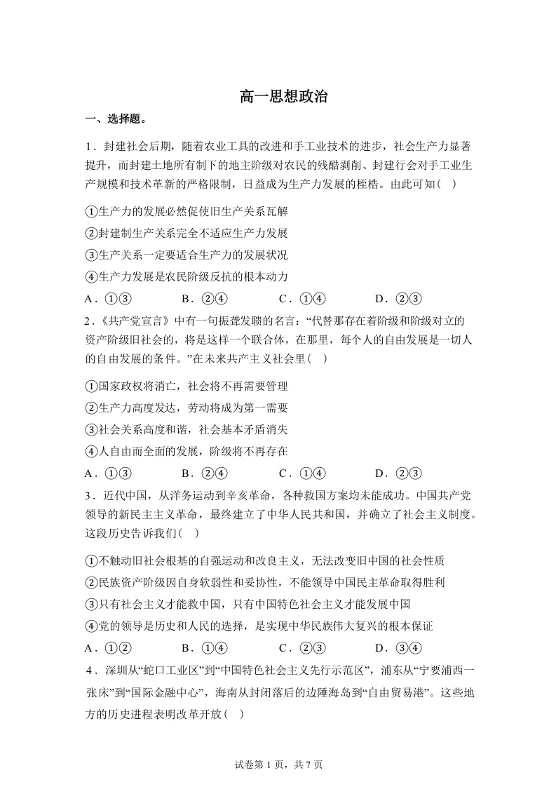 高一政治+答案--湖北省楚天协作体2025-2026学年高一下学期3月阶段检测