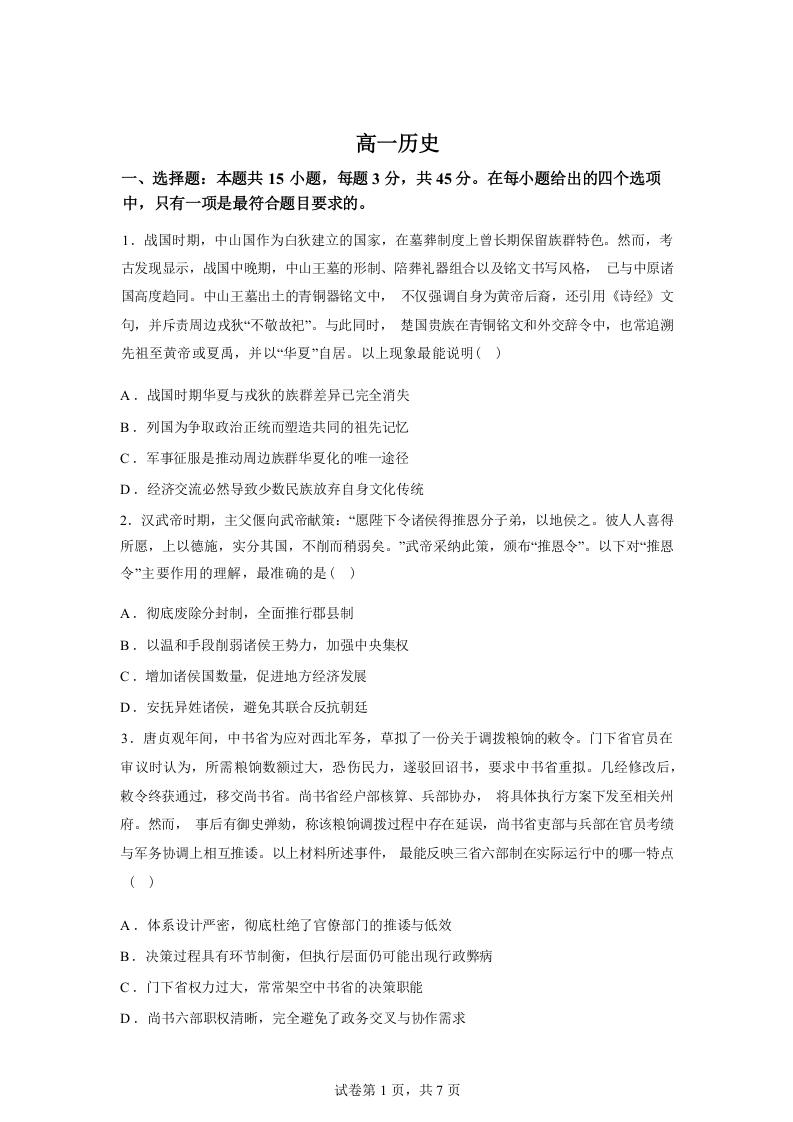 高一历史+答案--湖北省楚天协作体2025-2026学年高一下学期3月阶段检测