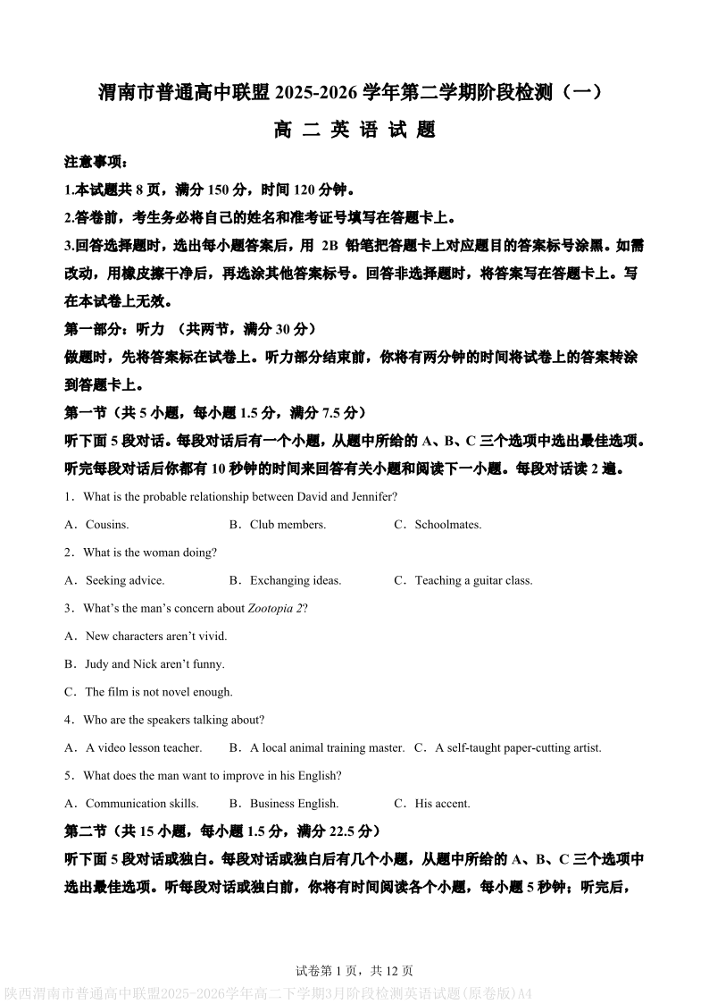 高二英语(原卷版)--陕西省渭南市普通高中联盟2025-2026学年高二下学期3月阶段检测
