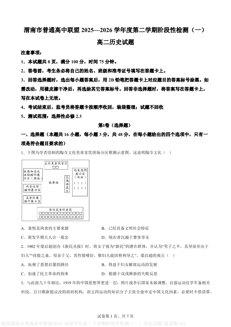 高二历史(原卷版)--陕西省渭南市普通高中联盟2025-2026学年高二下学期3月阶段检测