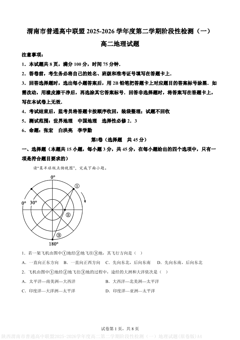 高二地理(原卷版)--陕西省渭南市普通高中联盟2025-2026学年高二下学期3月阶段检测