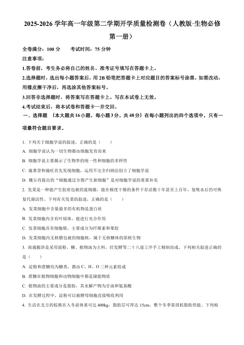 高一生物(原卷版)--云南曲靖市宣威市民族中学、七中等校2025-2026学年高一下学期开学检
