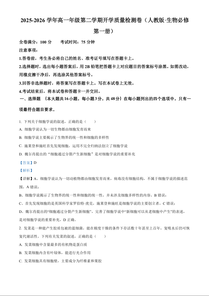 高一生物(解析版)--云南曲靖市宣威市民族中学、七中等校2025-2026学年高一下学期开学检