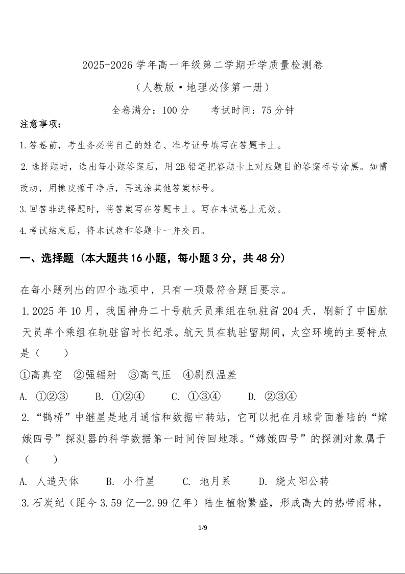 高一地理+答案--云南曲靖市宣威市民族中学、七中等校2025-2026学年高一下学期开学检