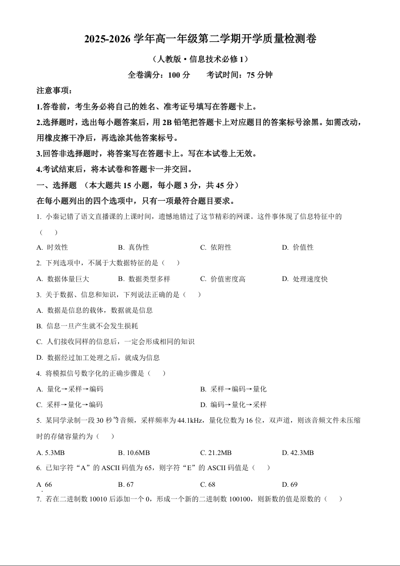 高一技术(原卷版)--云南曲靖市宣威市民族中学、七中等校2025-2026学年高一下学期开学检