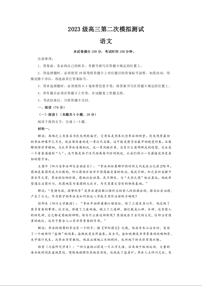 高三语文+答案--四川省成都市2023级高三下学期第二次模拟测试(成都二诊)