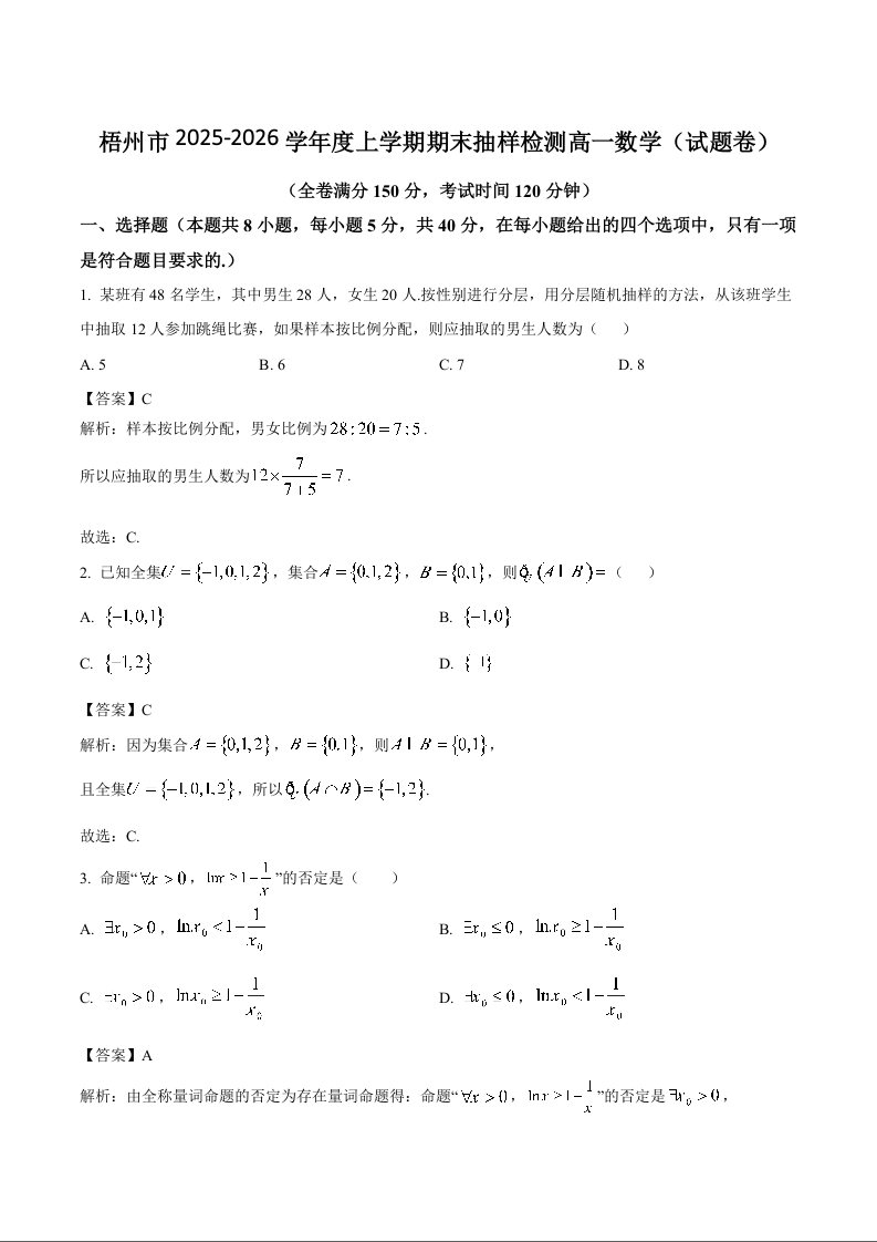 高一数学+答案--广西梧州市2025-2026学年高一上学期期末抽样检测