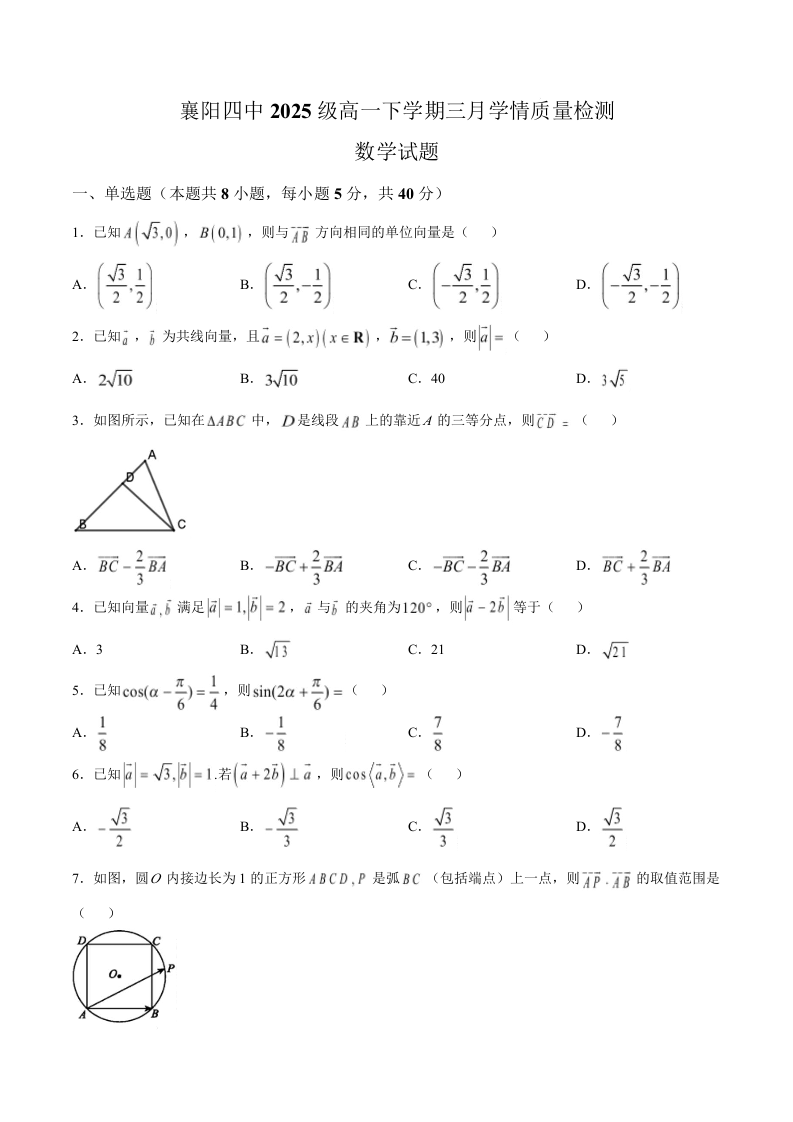 高一数学+答案--湖北省襄阳市第四中学2025-2026学年高一下学期3月阶段检测