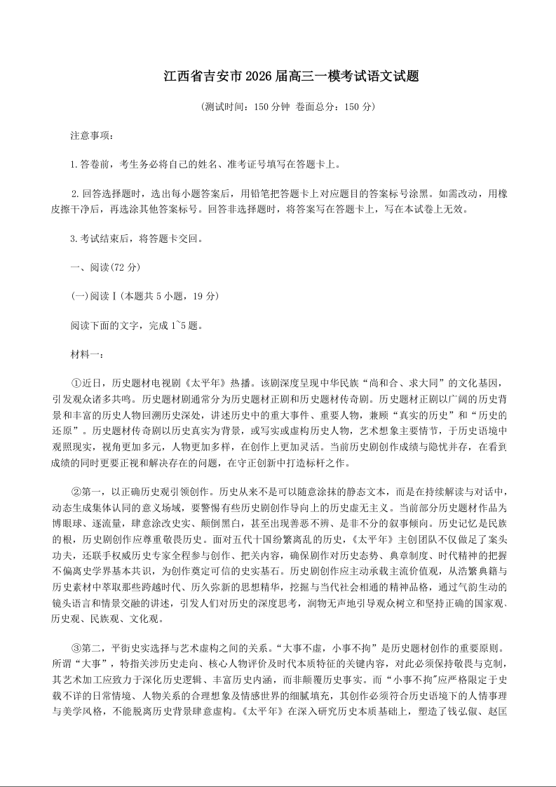 高三语文+答案--江西省吉安市2026届高三下学期3月一模考试