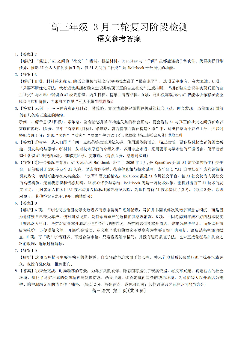 高三语文答案--江西广东省稳派智慧上进教育联考2026届高三下学期3月二轮复习阶段检测