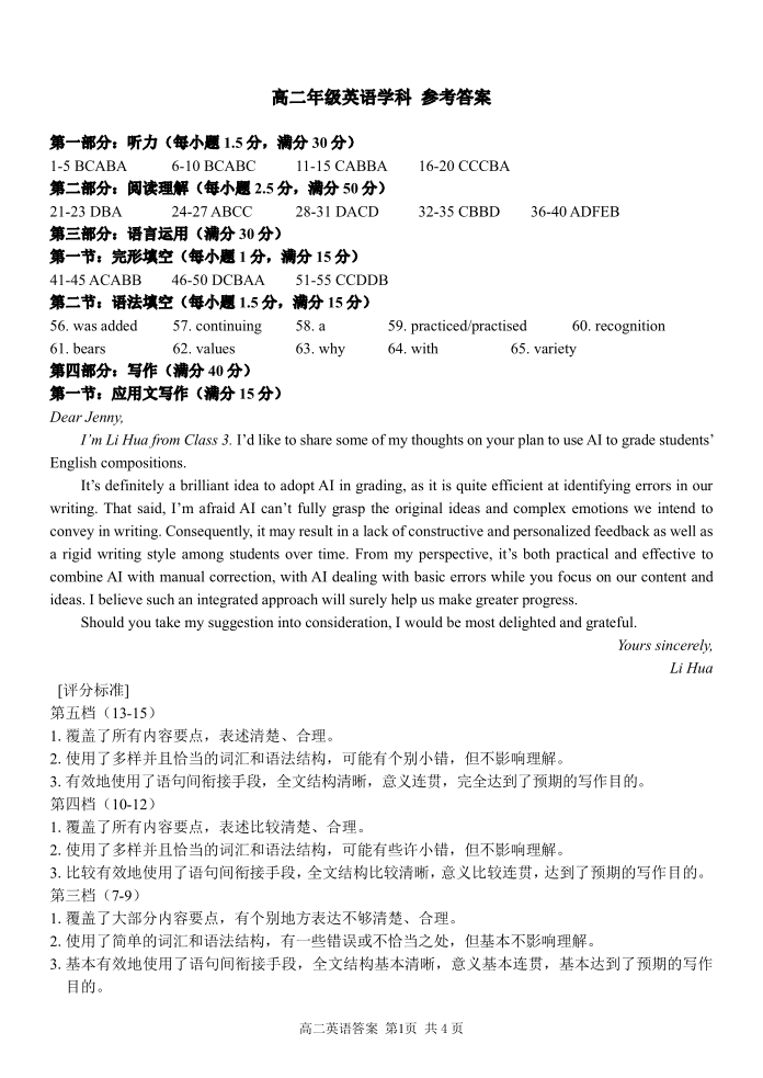高二英语答案--浙江四校(含精诚联盟)2025-2026学年高二下学期3月阶段检测