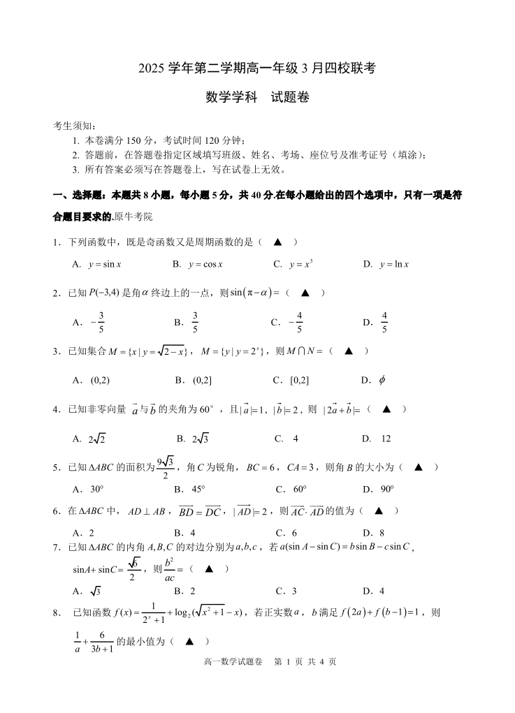 高一数学--浙江四校(含精诚联盟)2025-2026学年高一下学期3月阶段检测