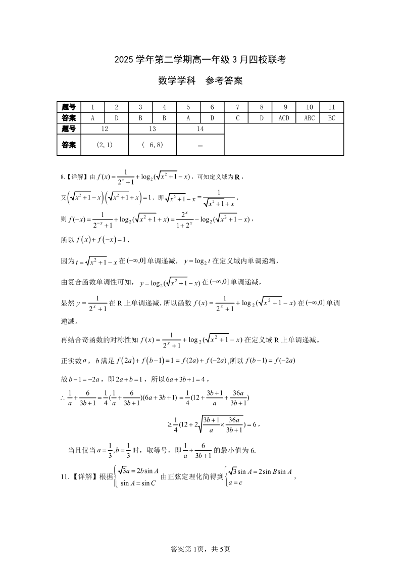 高一数学答案--浙江四校(含精诚联盟)2025-2026学年高一下学期3月阶段检测