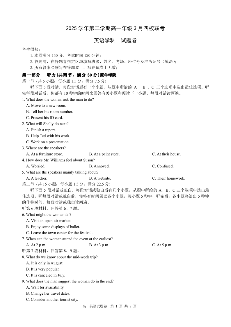 高一英语--浙江四校(含精诚联盟)2025-2026学年高一下学期3月阶段检测