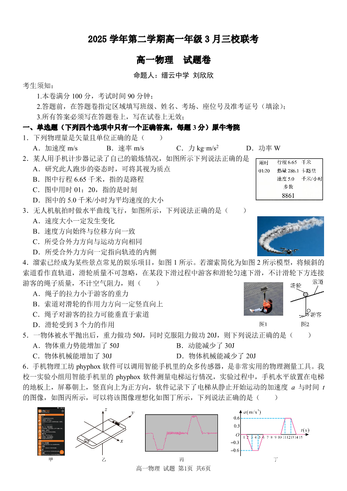 高一物理--浙江四校(含精诚联盟)2025-2026学年高一下学期3月阶段检测