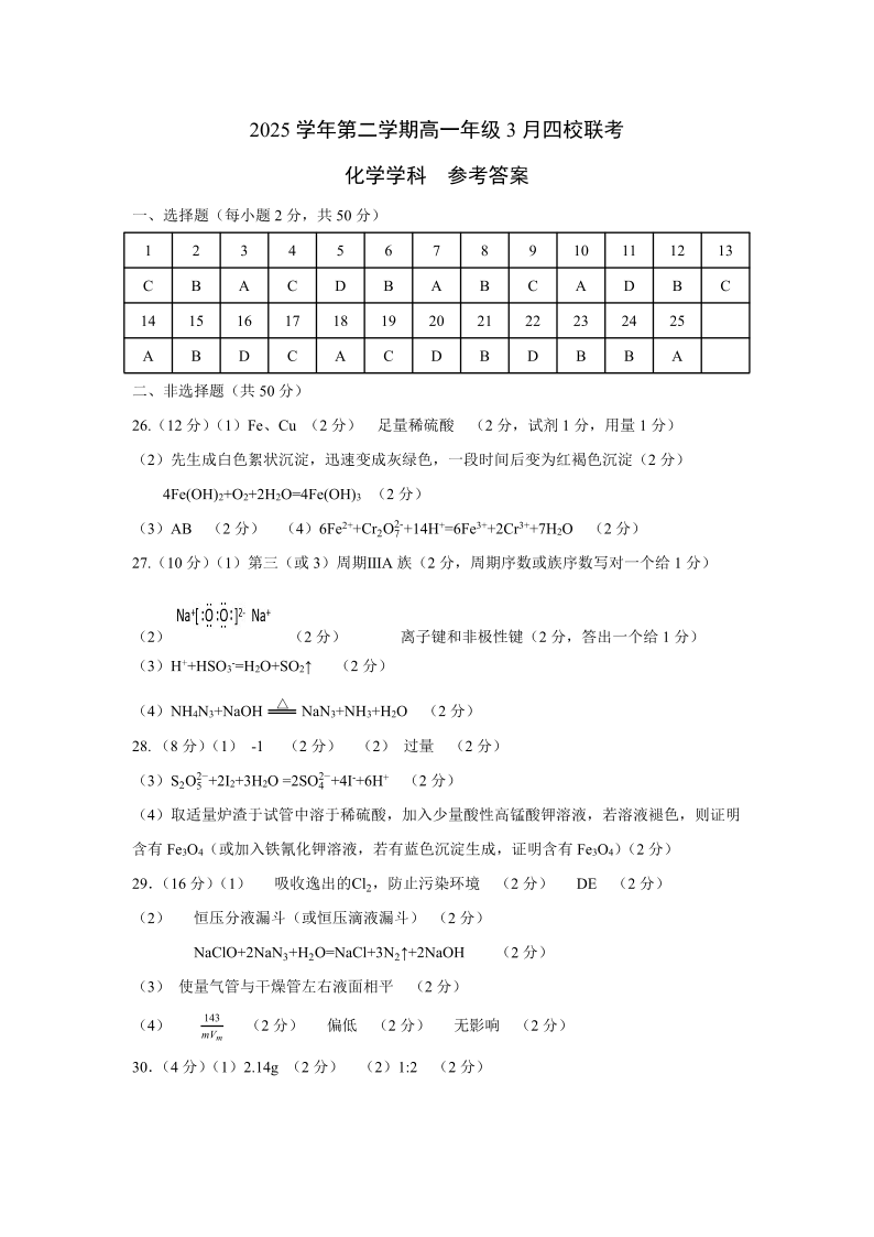 高一化学答案--浙江四校(含精诚联盟)2025-2026学年高一下学期3月阶段检测