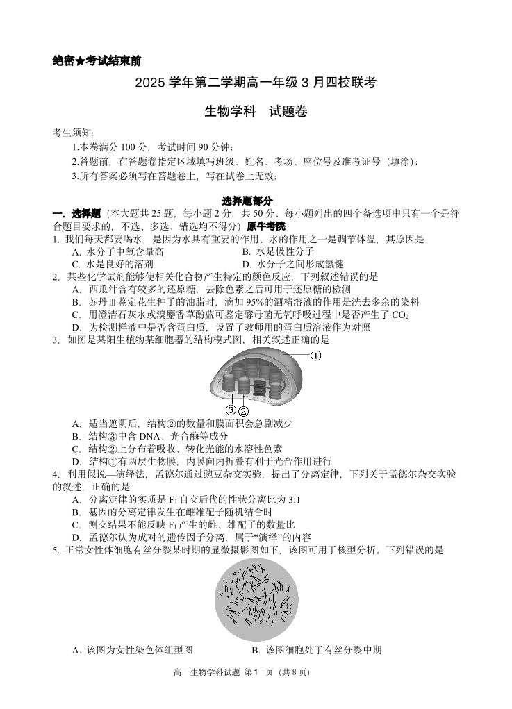 高一生物--浙江四校(含精诚联盟)2025-2026学年高一下学期3月阶段检测