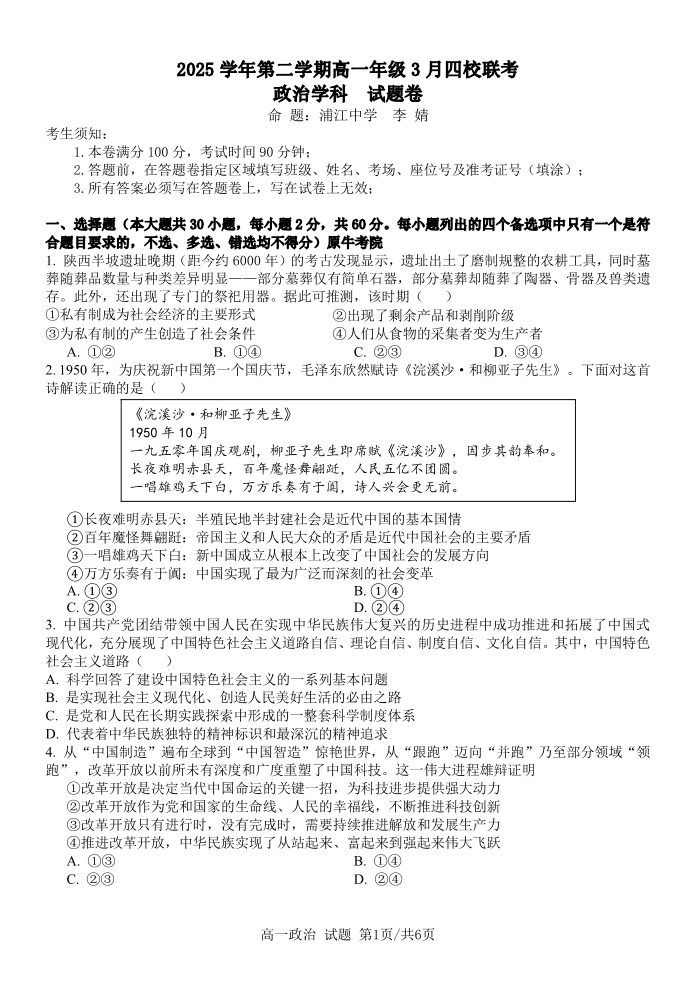 高一政治--浙江四校(含精诚联盟)2025-2026学年高一下学期3月阶段检测