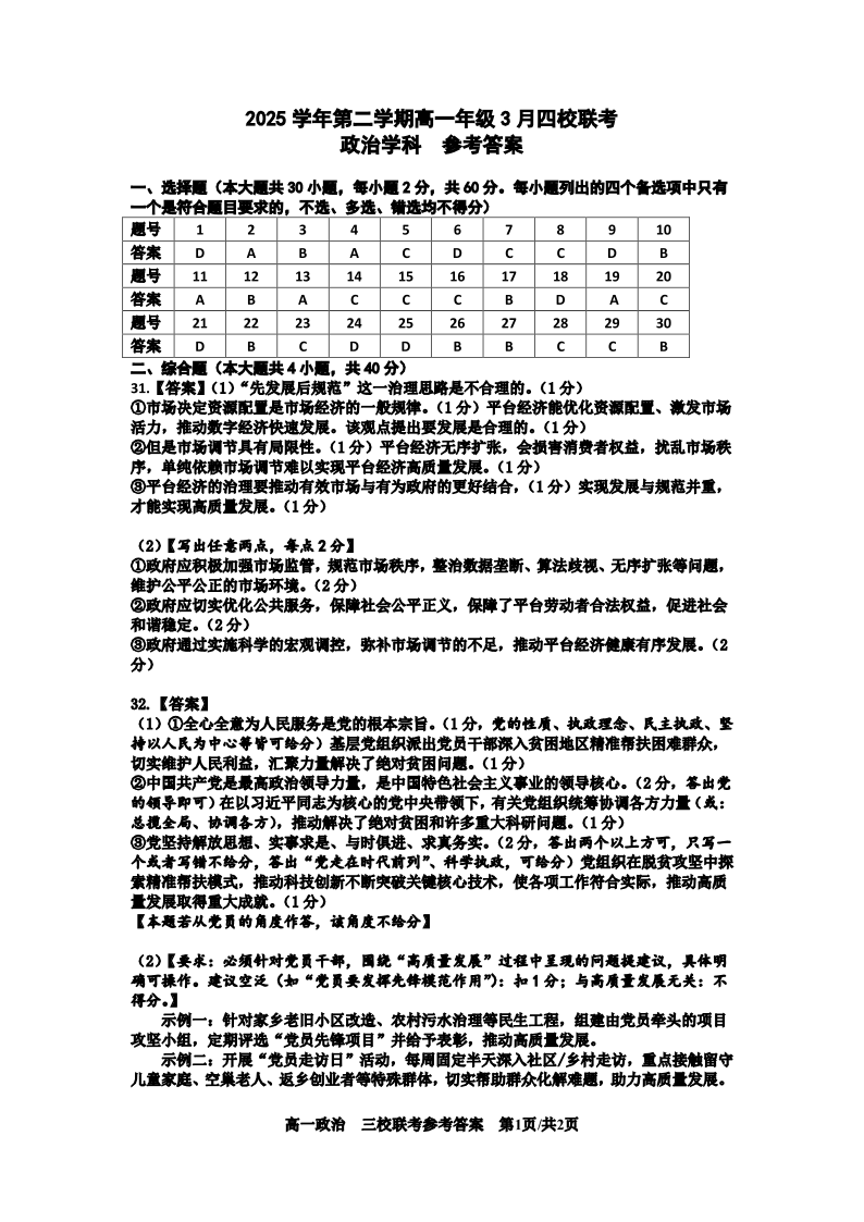 高一政治答案--浙江四校(含精诚联盟)2025-2026学年高一下学期3月阶段检测