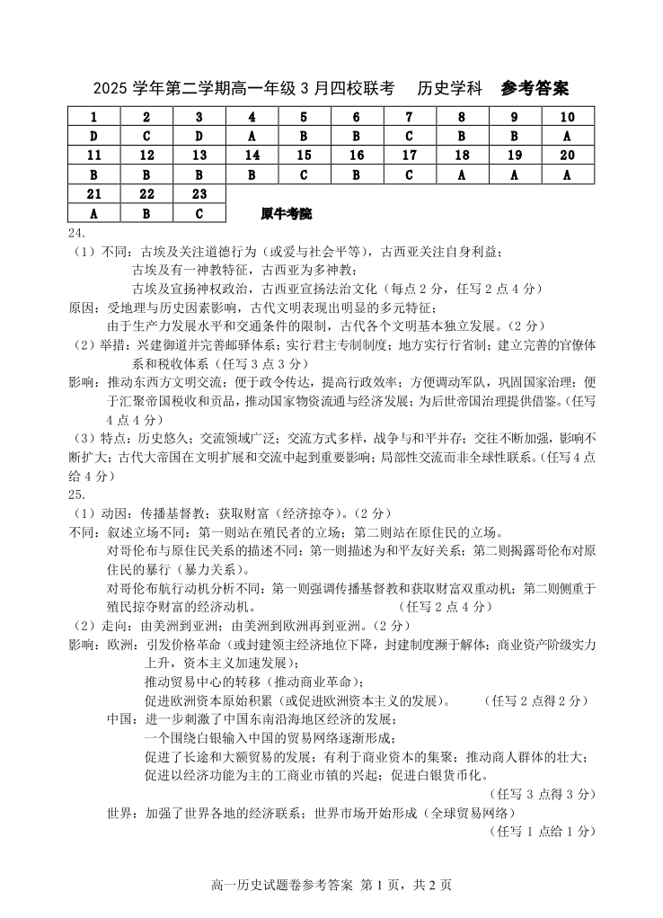 高一历史答案--浙江四校(含精诚联盟)2025-2026学年高一下学期3月阶段检测