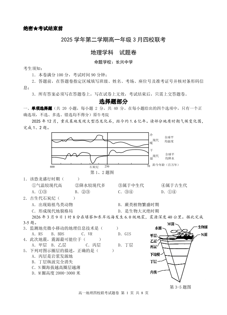 高一地理--浙江四校(含精诚联盟)2025-2026学年高一下学期3月阶段检测