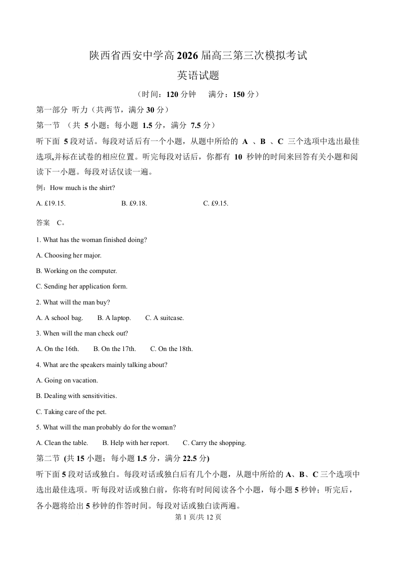 高三英语(原卷版)--陕西省西安中学高2026届高三第三次模拟考试