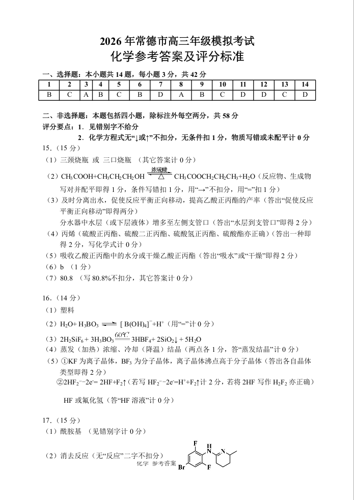 高三化学答案--湖南省常德市2026届高三下学期3月模拟考