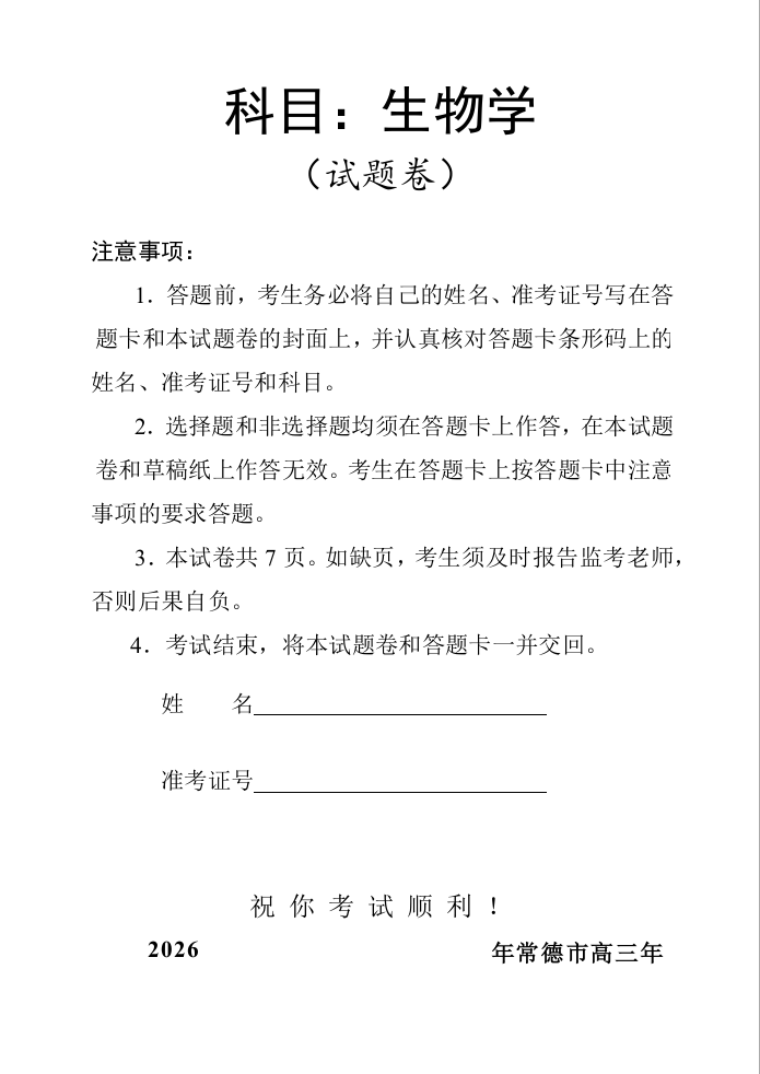 高三生物--湖南省常德市2026届高三下学期3月模拟考