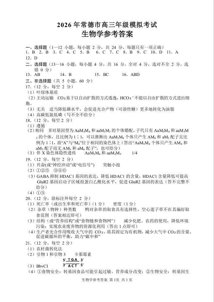 高三生物答案--湖南省常德市2026届高三下学期3月模拟考