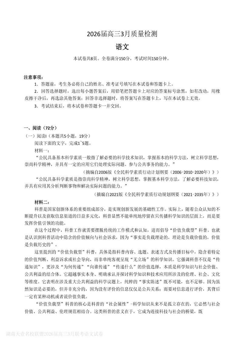 高三语文--湖南省天壹名校联盟2026届高三下学期3月质检